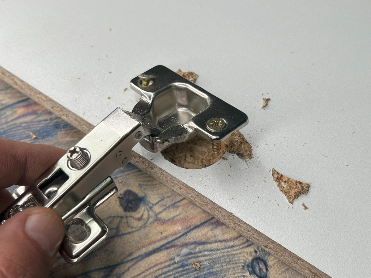 Вот и финальный шаг! После того как клей полностью высох, установите петлю на прежнее место, закрепив её саморезами в новом прочном основании.Повесьте дверцу шкафа, и всё готово! Теперь можно забыть о проблеме — крепление станет надёжным и прослужит долгие годы.