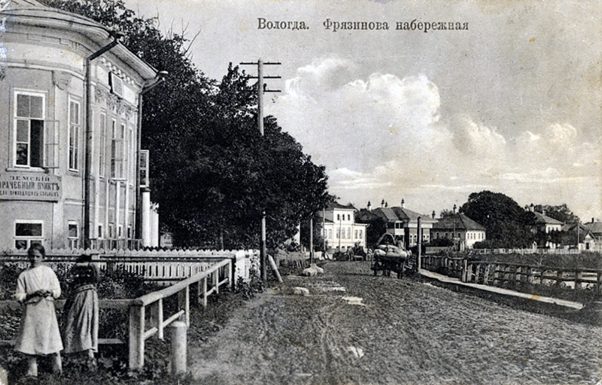 На открытке 1912 года вид на Фрязиновскую набережную. Здесь она помечена как Фрязинова, но это тогда было уже устаревшее к тому времени название. В газетах тех лет адрес печатали именно как Фрязиновская набережная. Сейчас это Набережная 6 Армии и если в наше время свернуть влево перед девчушкой на открытке, то вы увидите ТЦ Макси на улице Горького у площади Чайковского. Соответственно в районе домов, которые впереди, сейчас стоит мост 800-летия Вологды. На каменном доме слева на табличке можно прочитать надпись - «Земский врачебный пункт для приходящих больных». Так что, если бы вы были крестьянином Вологодского уезда, то за врачебной помощью пришлось бы ехать сюда. Работало заведение в этом доме с 1906 года. Куда же делись все эти прекрасные дома, что стояли на Фрязиновской набережной? 1 августа 1920 года в заречной части Вологды произошёл один из сильнейших городских пожаров, от которого пострадало более 3000 человек. В течении нескольких часов огнём было повреждено и уничтожено боле