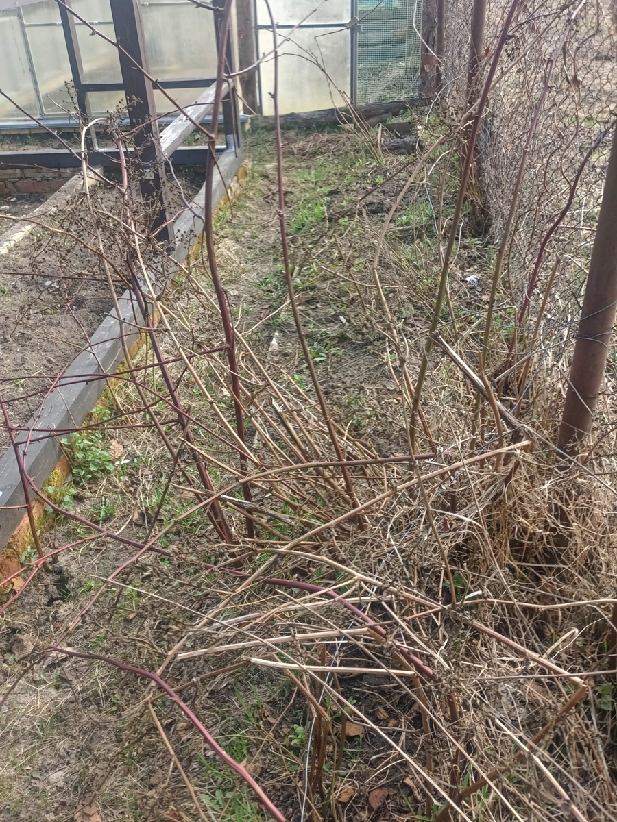 Плёнкой накрыть. Но вначале каркас доделать. А чтоб за каркас приступить вокруг очистить нужно. А тут заросли ежевики. И хмеля. Значит с них и начнём.