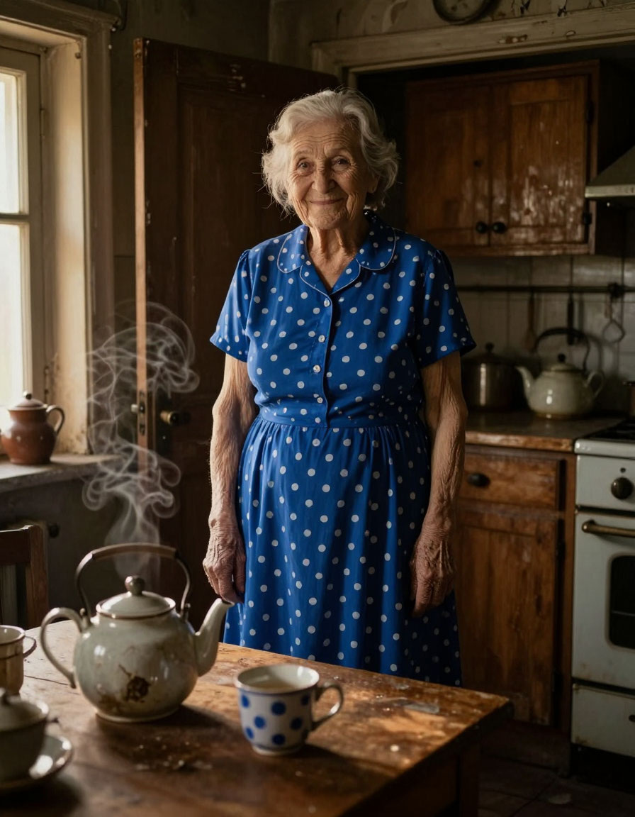 В дверном проёме, в том самом синем платье в белый горошек, стояла баба Шура. Она улыбалась — ласково, по-родному.