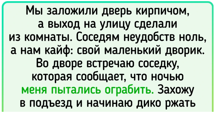 - Мы живем на 1-м этаже и, поскольку планировка позволяет, заложили входную дверь кирпичом, а выход на улицу сделали из маленькой комнаты, окна которой выходят на заднюю часть дома. Там же обустроили детям песочницу, а себе столик со скамейкой. Соседям неудобств ноль, а нам кайф: в подъезд не выходим совсем, да еще и свой маленький дворик. Иду на работу, во дворе встречаю соседку, которая сообщает, что ночью меня пытались ограбить. В замешательстве захожу в подъезд впервые за долгое время и начинаю дико ржать. Нам вскрыли входную дверь! Представляю лица воров, когда они наткнулись на стену.