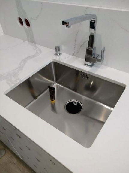 Мойка изготовлена из смеси кварцевой крошки (до 90-95%) и полиэфирных смол. Плюсы: однородная структура без пор, не впитывает грязь и запахи, не требует пропиток, огромный выбор цветов. Минусы: боится очень высоких температур (сковороду с пылу с жару лучше ставить на решётку, а не прямо на дно), цена выше среднего. Это оптимальный выбор для 90% современных кухонь.