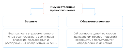 Как мы говорили раньше, имущественные правоотношения связаны с правами, сопряжёнными с владением, пользованием и распоряжением имуществом. В их рамках выделяют вещные и обязательственные отношения.
