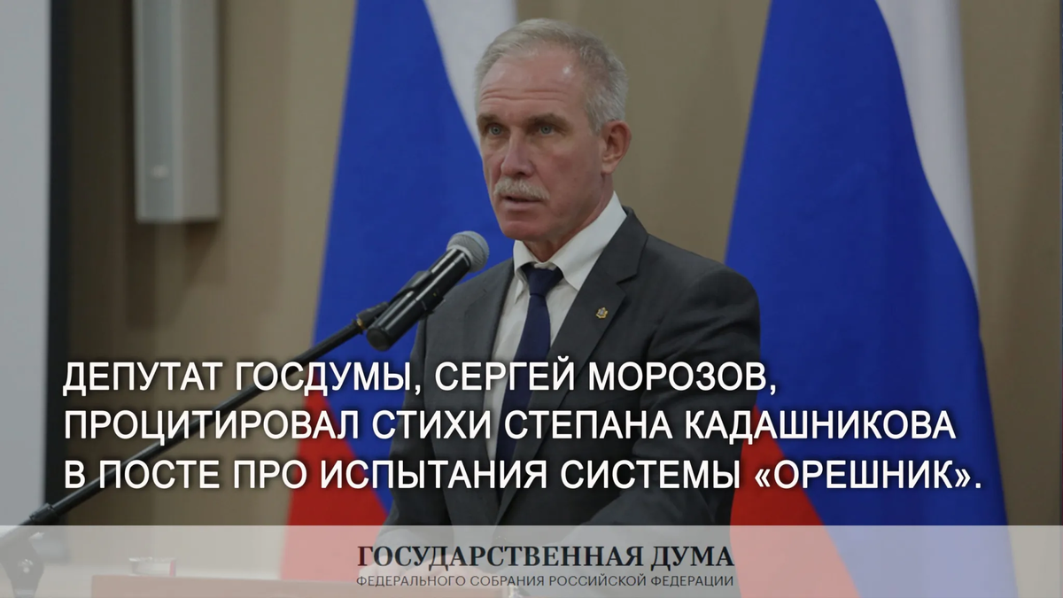 Депутат Государственной Думы, первый заместитель председателя комитета Думы по региональной политике и местному самоуправлению, Сергей Морозов, процитировал в своём посте стихотворения Степана Кадашникова «Кто на Русь с мечом» и «Мы говорили с мамой о войне».