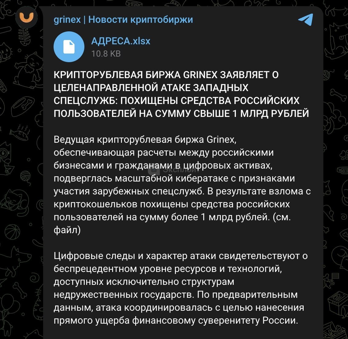 Криптовалютная биржа Grinex сообщила о взломе, в результате которого похищено средств на сумму около 1 млрд рублей. По данным биржи, атака носила признаки вмешательства западных спецслужб. Похищенные средства были конвертированы в TRX и переведены на один адрес, где сейчас хранится 45,9 млн TRX (примерно 15 млн долларов). Платформа временно приостановила работу. Материалы по инциденту переданы в правоохранительные органы. https://dzen.ru/id/5c0e38ff46ef5c00aaa80527