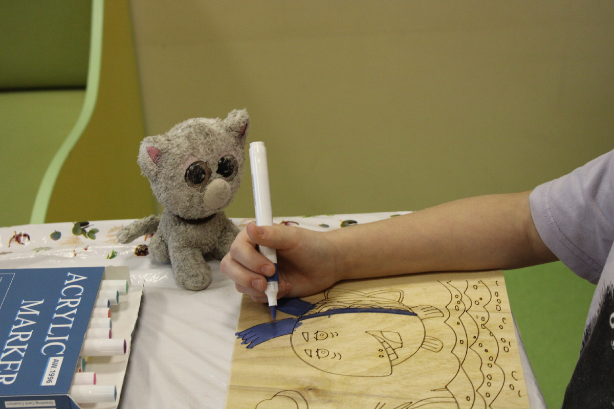 – Это Мокрый Мяу, – ответила нам девочка. – Почему он мокрый? – нам стало еще интереснее. Оказалось, что «мокрый» он потому, что часто прыгает по лужам. Таня всегда берет его с собой – и в этот раз Мокрый Мяу тоже был рядом. Недавно вместе с волонтерами мы ездили в больницу с мастер-классом по росписи деревянных досок. Дети были в восторге: можно было реализовать все свои творческие идеи, раскрасить героев мультфильма «Летающие звери», а после покрытия лаком еще и унести работу с собой. Таня вместе с папой и любимым котом раскрашивала дощечку, тщательно подбирая цвета. Кирилл придумал свою уникальную технику нанесения красок: брал их губкой и широкими мазками наносил на доску. Так у него получилась абсолютно неповторимая работа, которая сразу отличалась от других. А наш частый гость на мастер-классах Арстан тщательно прорисовывал детали своей картины. Мы очень любим пое