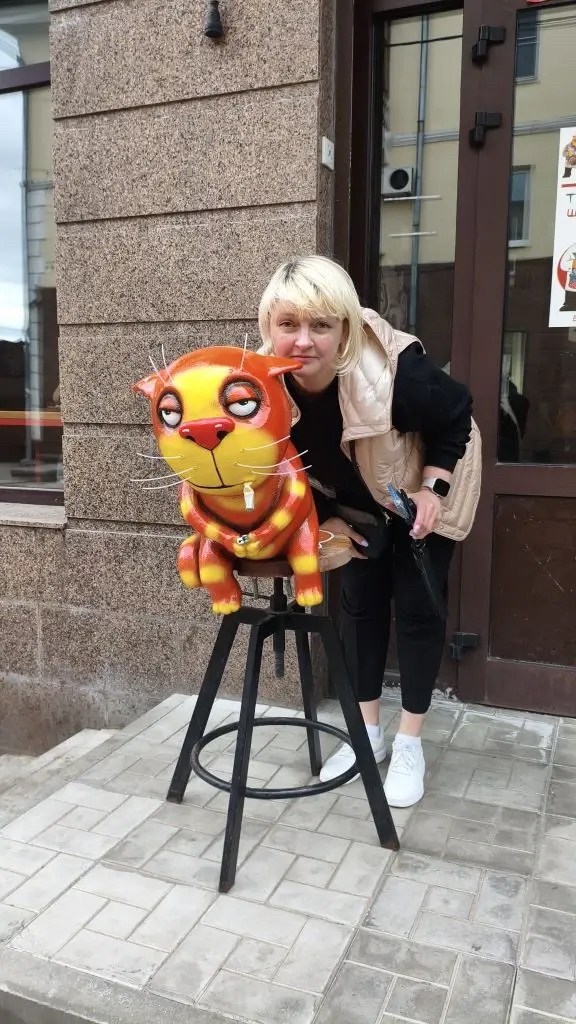 Уже у входа вас встречает забавный рыжий кот — персонаж картин Васи Ложкина. С ним все любят фотографироваться — и я не стала исключением!