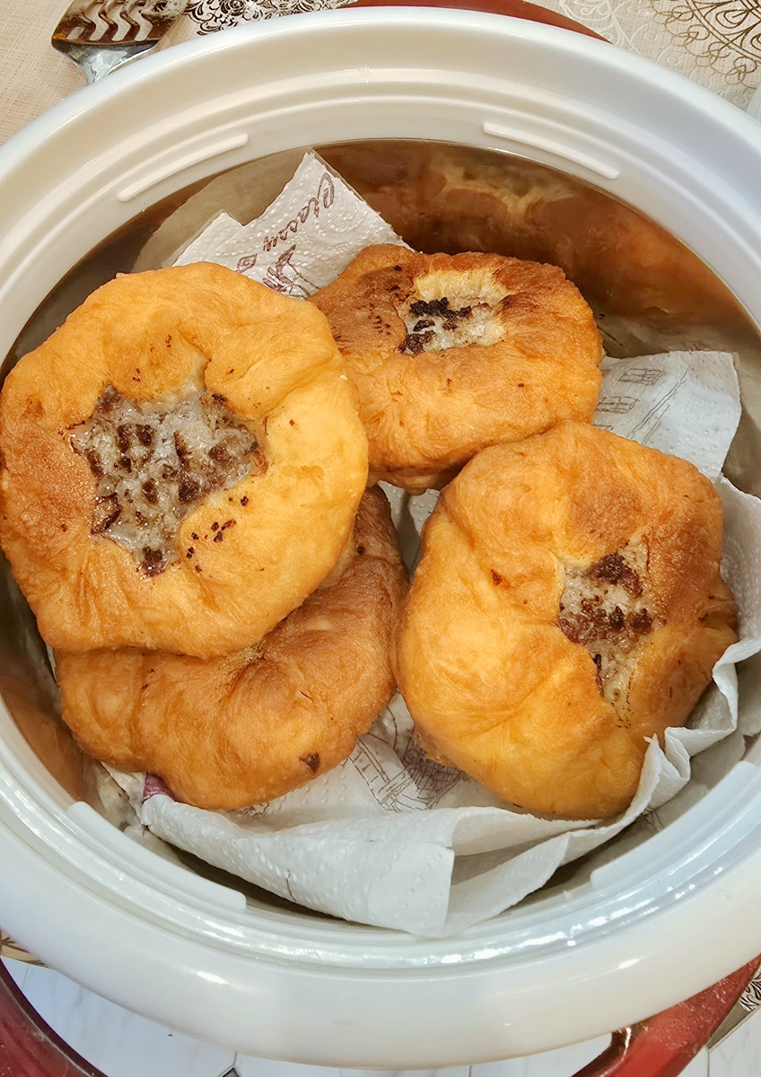 Беляш должен быть до середины в масле. Масло хорошо разогреваем , беляши кладем сначала начинкой вниз , жарим до золотистого цвета на умеренном огне с двух сторон. Сначала кладем фаршем вниз, переворачиваем , заливаем в дырочку ложку кипящего масла и жарим до золотистого цвета с другой стороны, переворачивать нельзя, крышкой накрывать не надо.