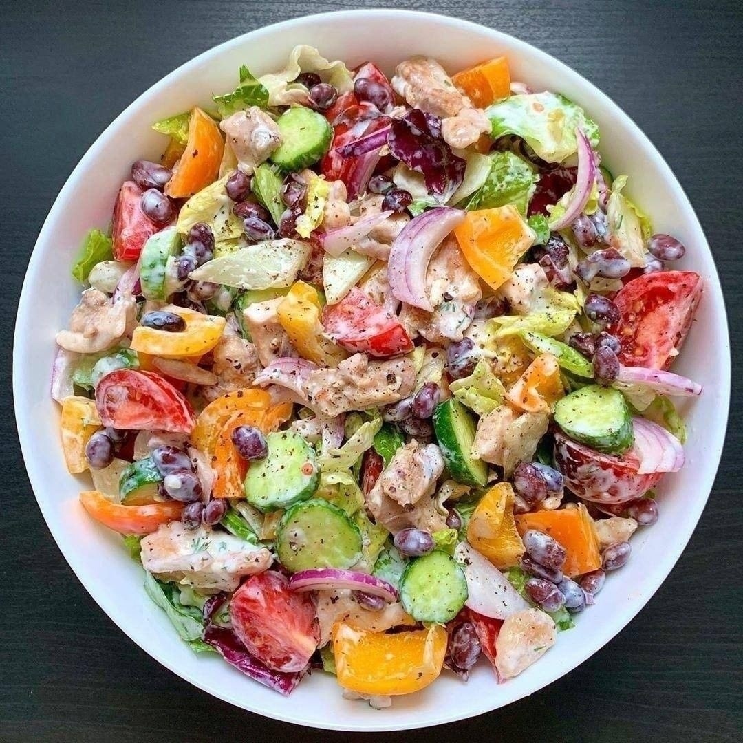 ⠀ Филе режем на средние кусочки и обжариваем на сковороде без масла, остужаем и отправляем к нарезанным овощам и фасоли.