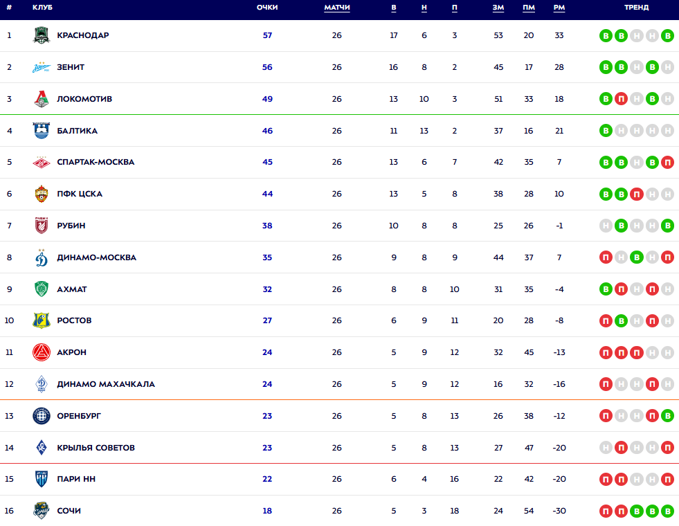 Приветствую уважаемые болельщики. (с) Орлы летают одиноко, бараны пасутся стадами. 21-23 апреля прошел 26-й тур (второй тур тройника): В туре прошли целых три очные битвы за выживание. Сочи-третья победа подряд, второй гол на 99-й минуте! Кони перестали побеждать. Судья чуть не прибил болотных пенальти на 99-й минуте. Газовик-2 вырвал волевую победу у не нужных в последние 10 минут. Быки снова первые. Сочи - Крылья Советов 2-1 прогноз 1-1. ЦСКА - Ростов 1-1 прогноз 2-0. Оренбург - Пари НН 2-1 прогноз 1-1. Динамо - Рубин 0-1 прогноз 2-1. Локомотив - Зенит 0-0 прогноз 1-1. Акрон - Динамо Мх 1-1 прогноз 1-1. Спартак - Краснодар 1-2 прогноз 2-2. Ахмат - Балтика 1-1 прогноз 1-1. Табличка перед 27-м туром: Лучшие по системе гол+пас:: Сперцян (Армения, Краснодар) 26 (12+14), Батраков (Локо) 21 (13+8), Кордоба (Колумбия, Краснодар) 19 (14+5), Глушенков (Зенит) 15 (9+6), Воробьев (Локо) 14 (10+4), Хиль (Сальвадор, Балтика) 14 (13+1), Дзюба (Акрон) 13 (8+5), Бителло (Бразилия, Динамо) 13 (6+7)