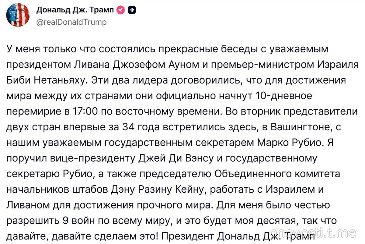 🕊️ Ливан и Израиль объявят перемирие сегодня в 17:00 по восточному времени — стороны официально договорились