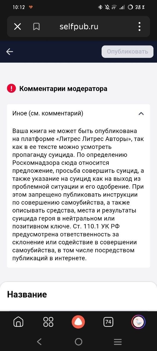 Следом она прислала саму книгу. Про суицид там только в начале, к тому же про неудачный. Какой здравомыслящий человек, прочитав про суицид, пойдёт прыгать с крыши и т. д. и т. п.? Помните, в детстве всегда говорили: «Он/она/они с крыши пойдут спрыгивать, тоже пойдёшь?» Сейчас это как никогда актуально. Всегда надо думать своей головой. Или из-за чего такая цензура пошла? Сейчас молодежь вообще что ли неадекватная: прочтёт про суицид, пойдёт и совершит его? Прочтёт про алкоголь — сразу начнёт спиваться, и дальше по списку про запрещёнку и т. д.? Неужели те, кто запрещает всё это, реально не понимают, что цифры 18+ ещё никогда никого не останавливали? Да мы в GTA играли, когда нам было по 10 лет, и ничего не стали ходить по улицам и кромсать всех налево направо. К чему это я возмущаюсь? Просто в книге, над которой я работаю, главный герой бухает с вороном половину книги 😂🙈 И это притом, что я не употребляю алкоголь совсем, но так получилось у героя, что поделать 🤷♂️ Получается, в