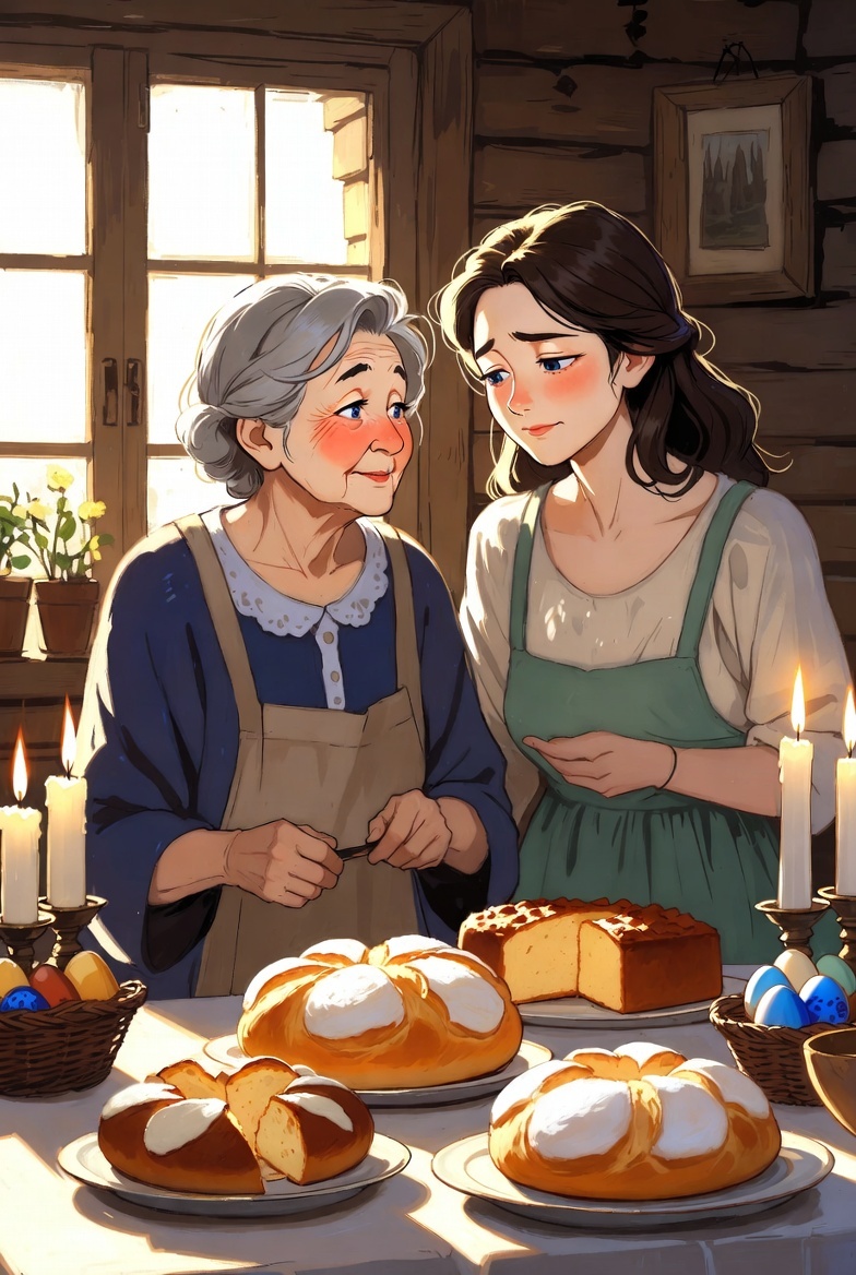 В доме пахло точно так же, как в детстве: воском, свежим хлебом и чуть-чуть старым деревом. На столе уже стояла пасха — творожная, с изюмом, украшенная цукатами в виде креста. Рядом лежали крашенки — красные, как кровь, и золотистые, как солнце.