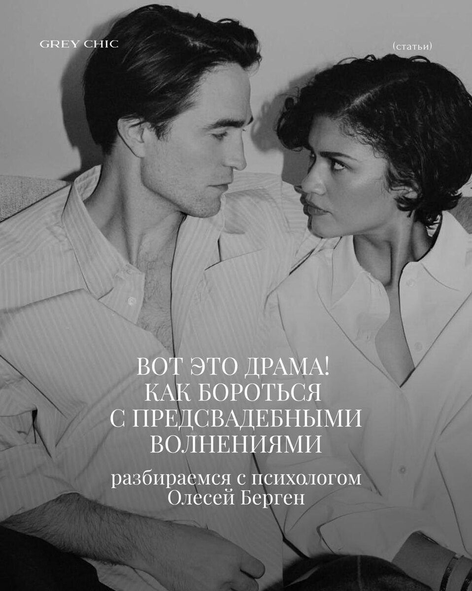 В российский прокат вышел нашумевший «ромком наоборот» — «Вот это драма!» — картина о любви и свадьбе. Посмотрели на дуэт Роберта Паттинсона и Зендеи, проанализировали почти все сценарии волнений перед замужеством (и церемонией!) и спросили Олесю Берген, психолога и автора телеграм-канала «Без тревог», как не превратить подготовку к собственной свадьбе в кошмар. Полную статью ищите на нашем сайте. GREY CHIC журнал | GREY CHIC в Вк | GREY CHIC в Max