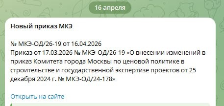 Нормативная документация Москвы. Друзья, только что mos.ru опубликовал новый Приказ и через бот ТГ сразу пришло уведомление в личку. Если для вас это актуально - оперативно получать информацию, можно подписаться через https://t.me/smeta_tsn_bot?start=orders. Кроме того, перейдя по ссылке, сразу увидите короткую аналитическую справку: что за Приказ и зачем. Таким образом, мы тестируем новый сервис, в котором размещено уже более 100 Приказов МКЭ с ссылками на официальные источники. MAX TELEGRAM