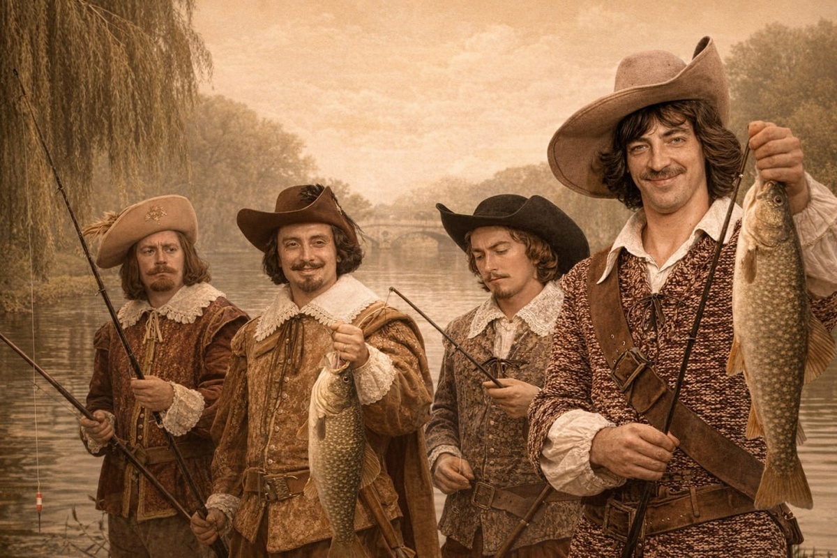 От подписчика @leto_2555 Переработай изображение так, чтобы Д’Артаньян и три мушкетёра оказались на рыбалке. Пусть они стоят у реки с удочками, одетые в свои исторические костюмы — шляпы и камзолы. Атос выглядит сосредоточенным, Портос улыбается и держит большую рыбу, Арамис задумчиво смотрит на поплавок, а Д’Артаньян позирует с гордой улыбкой, будто только что поймал трофей. Фон — живописный берег реки с ивами и старинным мостом. Цветовая гамма — тёплая, с лёгким сепиевым оттенком. most-AI.com - 80+ популярных нейросетей в одном приложении без VPN. Лучшие цены! 75% кэшбэка на бонусный баланс по промокоду PROMPT1RU_75 Syntx - лучший телеграмм бот Еще у нас есть специальный раздел на сайте https://prompt1.ru/tematika-izobrazheniya/kino/ #смешные@prompt1_ru #кино@prompt1_ru #рыбалка@prompt1_ru #ретро@prompt1_ru
