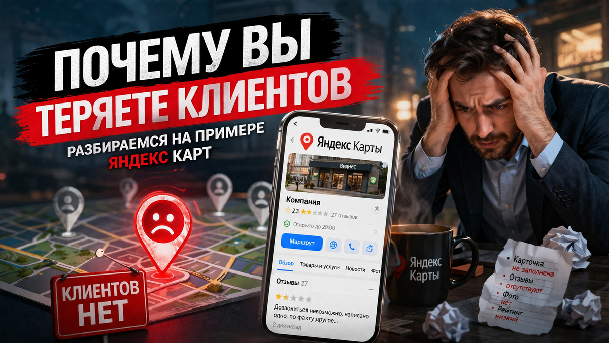 Если у вас есть офлайн-бизнес — салон красоты, стоматология, медицинская клиника, автосервис или кафе — скорее всего, вы уже есть в Яндекс Картах. И в этот момент обычно возникает логичная мысль: «Ну всё, нас теперь точно найдут» Но на практике всё немного иначе. 👉 Само наличие карточки почти никогда не приносит клиентов. Многие предприниматели думают, что достаточно просто «присутствовать» на карте. Но давайте посмотрим, как ведёт себя обычный клиент. И что происходит дальше? До остальных он просто не доходит. Даже если вы лучше. Даже если у вас дешевле. Даже если вы рядом. Каждый день всё выглядит примерно так: И чаще всего — это не вы. 👉 Просто потому, что вас либо не видно, либо карточка не вызывает доверия. Мы недавно разбирали профиль одной клиники. Ничего не меняли в услуге, ценах или персонале — работали только с карточкой. Проработали визуал и семантику. То есть клиенты уже были — просто раньше они проходили мимо. Многие до сих пор воспринимают карточку как формальность. Но