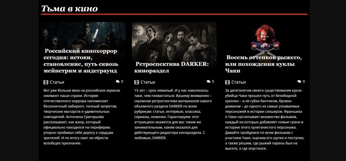 Читайте в киноразделе апрельского номера онлайн-журнала DARKER: – Статью Антонины Григорьевой о развитии российского хоррора в кино; – Обзорную статью – ретроспекцию материалов кинораздела DARKER; – Статью Глеба Габбазова о похождениях зловещей куклы Чаки. Также читайте рецензии на новинки жанрового кино и произведения классики, среди которых: – «Головокружение» Альфреда Хичкока; – «Доктор Лам», криминальный хоррор на основе реальных событий; – «Крик 7», новая часть культовой франшизы; – «Невеста!», новая экранизация истории о Чудовище Франкенштейна; – «На помощь!», новый фильм Сэма Рэйми, живой легенды хоррора; – «Проклятый рыцарь», интригующий средневековый хоррор со звездами «Игры престолов» в главных ролях. Также читайте рецензии на третий сезон мультсериала «Первобытный» и «Фоллаут». Новый номер выходит традиционно в ночь с 19 на 20 число. Ждите! И, кстати, напомним, что наши спонсоры на Бусти могут все это и многое другое прочитать уже сейчас: boosty.to/darker