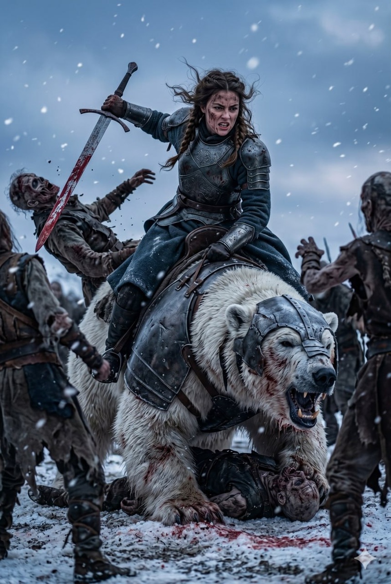 От подписчика 372dft Максимально реалистичный кинематографичный кадр. Снято на полнокадровую камеру. Запрещается стилизация, иллюстрирование, CGI - только чистый реализм. Женщина-воин близким планом, в полный или почти полный рост, верхом на гигантском бронированном белом медведе в самом эпицентре яростного сражения. Вокруг заснеженная равнина, вытоптанный до грязи и крови снег, динамично падающие хлопья на переднем плане размыты (motion blur). У женщины суровое, волевое лицо, испачканное гарью и каплями крови, волосы заплетенные в кому растрепались. Лицо замерло в выражении ярости и отчаяния. На ней надето тяжелое многослойное платье из плотной серо-синей шерсти, поверх которого закреплена функциональная латная броня: кованый нагрудник с чеканкой, массивные наплечники и наручи из вороненой стали с царапинами и следами ударов. В правой руке она сжимает огромный двуручный меч (клеймор), на лезвии которого видны свежие пятна крови. Огромный полярный медведь с мощными лапами и оскаленн