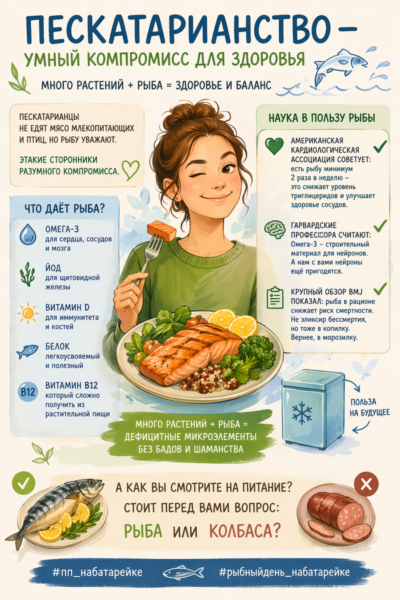 Бывают такие вегетарианцы, которые вроде бы вегетарианцы, но не совсем. Нет, на жизнь млекопитающих и птиц они не покушаются, но вот рыбу за мясо не считают едят. Называются пескатарианцами. Этакие сторонники компромисса. Кстати, вполне разумного. В отличие от "натуральных" вегетарианцев и тем более веганов, они свою дозу омега-3, йода, витамина D получают из рыбы. И белок тоже, который усваивается легче, чем многие растительные аминокислоты, из рыбы им доступен. И над БАДами не надо шаманить. Учёные, конечно, не пишут «ешьте скумбрию — и минус десять лет». Но кое-что интересное всё же накопали. Американская кардиологическая ассоциация, например, советует есть рыбу минимум 2 раза в неделю — из-за омега-3. Это помогает снизить уровень триглицеридов и улучшить здоровье сосудов. А Гарвардские профессора считают Омега-3 строительным материалом для нейронов. А нам с вами нейроны ещё пригодятся. Крупный обзор BMJ показал, что рыба в рационе снижает риск смертности. Не эликсир бессмертия, но