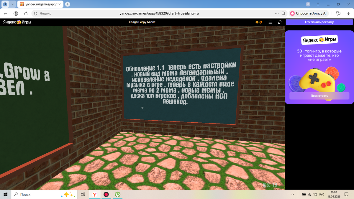Обновление 1.1 - Теперь есть настройки - Новый вид мема Легендарный - Исправление недоделок - Удалена музыка в игре - Теперь в каждом виде мема по 2 мема - Новые мемы - Доска топ игроков - Добавлены НПС пешеход Код обновления ; 5
