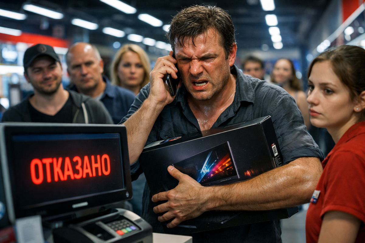 — В смысле закрыта?! — голос мужа в трубке сорвался на дребезжащий фальцет, перекрывая гул торгового центра. — Я стою у кассы с новым игровым ноутбуком! За мной очередь — человек пятнадцать! Ты понимаешь, как я сейчас выгляжу?!