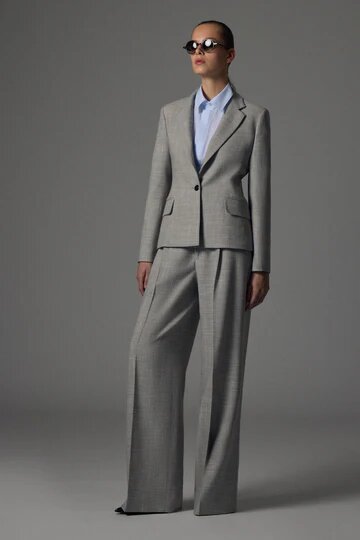 Пока одни бренды делают ставку на эффектный момент, SASUPHI предлагает вещи с более длинной жизнью: четкие костюмы, спокойные платья, правильные юбки, архитектурные линии и цвета, которые не устают. Именно поэтому эта коллекция выглядит не как мимолетная история на лето 2026, а как гардероб, к которому можно возвращаться снова и снова — и через сезон, и через два, и позже. Главная причина такой актуальности — крой. В коллекции много вещей, которые держатся не на модной прихоти, а на хорошей форме: широкие брюки, длинные жакеты, мягкие пальто-халаты, объемные юбки, лаконичные рубашки и длинные платья. Такие силуэты уже давно живут дольше одного сезона, потому что не привязаны к короткой модной волне. Это особенно видно по костюмам. Серый костюм с белой или голубой рубашкой, вариант с мягким трикотажем, более собранные и более расслабленные сочетания — все это легко представить и летом, и осенью, и следующей весной. Такие вещи не устаревают быстро, потому что их можно носить по-разному,
