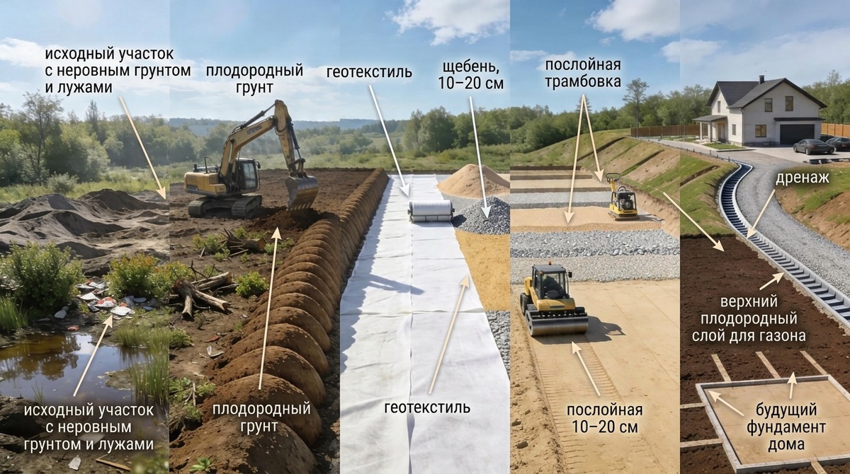 Мечта о своём доме обычно начинается с картинки в голове: терраса, мангал, зелёный газон. Но на практике всё начинается с грязи, техники и засыпки участка. Именно здесь многие сливают лишние деньги — просто потому, что делают всё «на глаз».
