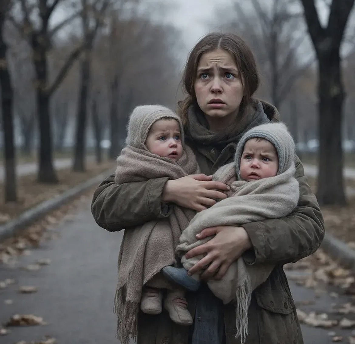 Там, свернувшись калачиком и укрывшись старым, выцветшим пледом в клетку, спала женщина. Рядом с ней стояла большая, потрёпанная хозяйственная сумка, из которой торчали какие-то тряпки и пустые пластиковые бутылки. Но самое страшное было не это. На краю скамейки, в импровизированной колыбели из двух смятых картонных коробок, лежали двое младенцев. Они были укутаны в какие-то старые кофты и были совсем крошечными — судя по всему, им было не больше нескольких месяцев. Они мирно сопели в унисон, их крошечные грудки мерно поднимались и опускались.