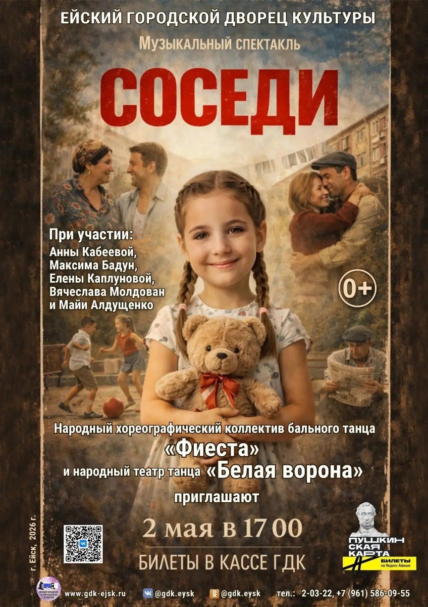 2 мая | 17:00 Музыкальный спектакль «Соседи» от народного хореографического коллектива бального танца «Фиеста» и народного театра танца «Белая ворона» Билеты можно приобрести в кассе по адресу: ул. Свердлова, 73/1, а также онлайн Цена: 300₽ 👌 Доступна Пушкинская карта. Это истории людей, которые жили рядом. Любили. Дружили. Ссорились. Мечтали. В каждом герое — ты или кто-то очень близкий. 💬 Подписывайтесь: @gdk.eysk