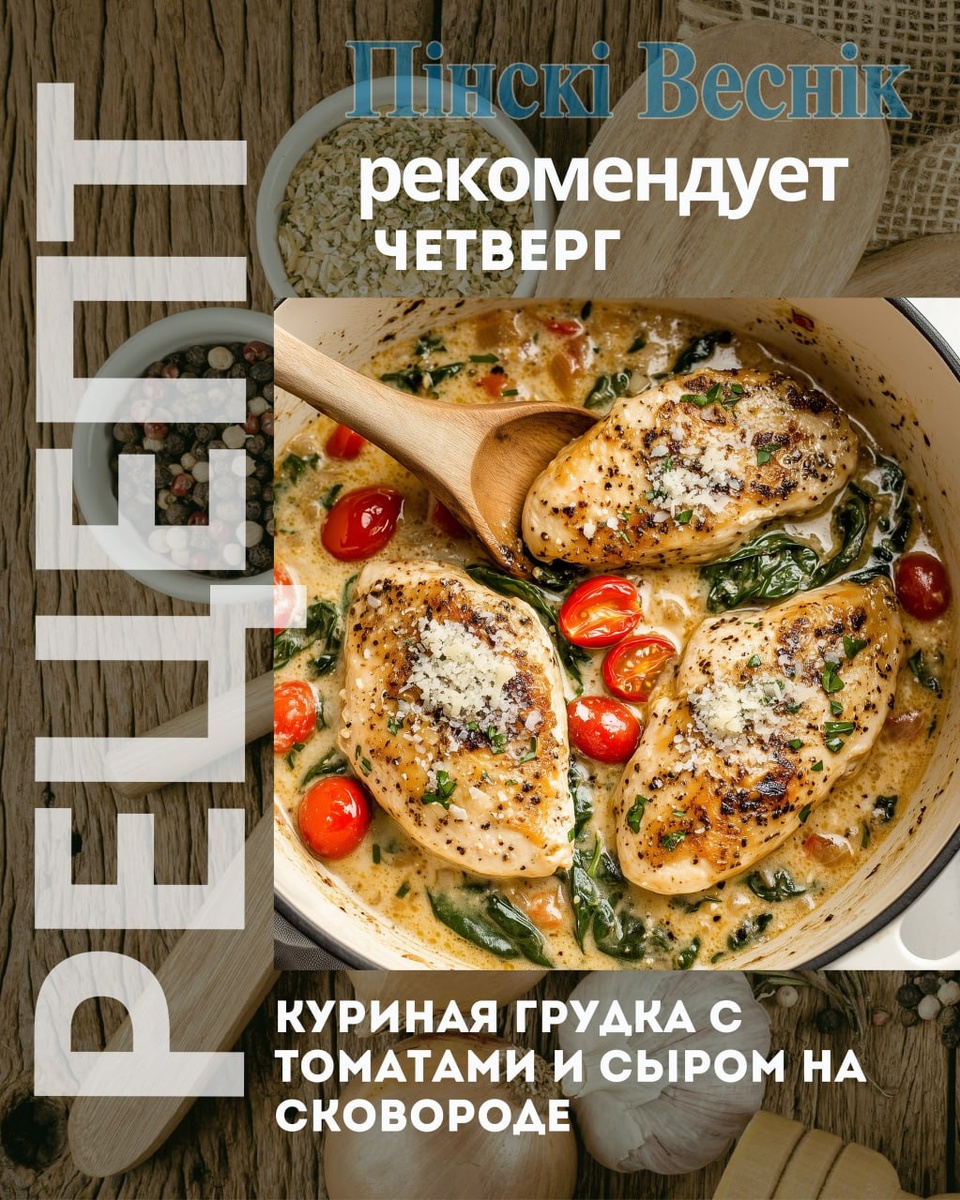 Ингредиенты: куриная грудка (2 шт.), помидоры (2 шт.), сыр (100 г), соль, перец, оливковое масло. Приготовление (20 мин): Грудку разрежьте вдоль, отбейте, посолите, поперчите. Обжарьте с двух сторон до румяной корочки (по 3–4 минуты). Сверху выложите кружочки помидоров, посыпьте тёртым сыром. Накройте крышкой, убавьте огонь, готовьте ещё 5 минут до расплавления сыра. @Пинский Вестник 📱Ютуб 📱ВК 📱ИНСТАГРАМ 📱ОК 📱ФЕЙСБУК 📱ТИК ТОК Сайт Прислать новость