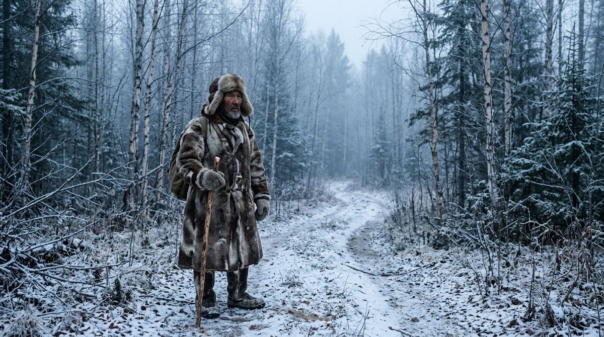 Старика я увидел издали. Он стоял прямо на тропе, не двигался. Невысокий, в оленьей дошке, тёмной, потёртой на плечах. Треух надвинут низко на лоб. Лицо тёмное, морщинистое, как кора лиственницы. Руки вдоль тела. Просто стоит и смотрит вперёд по тропе – туда, где должен был идти я.