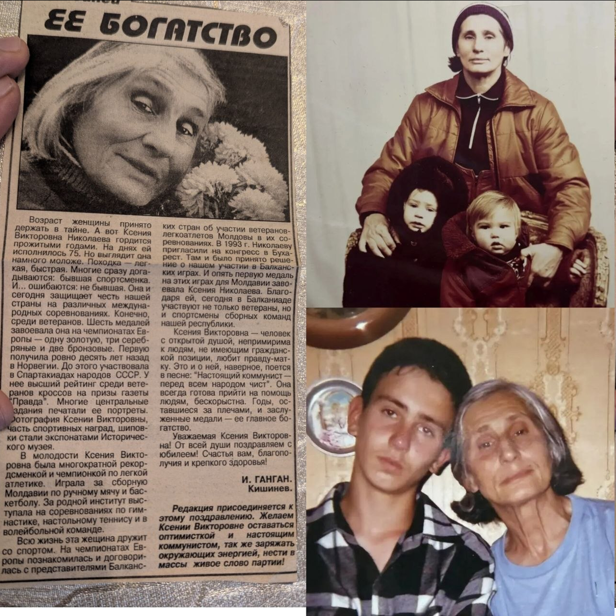 Вырезка из газеты о бабушке Гайдука - Николаевой Ксении Викторовне и фото с внуками. На первом фото маленький Женя слева, а на втором Женя Николаев в подростковом возрасте вместе со своей любимой бабушкой. Из газеты: "Возраст женщины принято держать в тайне. А вот Ксения Викторовна Николаева гордится прожитыми годами. На днях ей исполнилось 75. Но выглядит она намного моложе. Походка легкая, быстрая. Многие сразу догадываются: бывшая спортсменка. И... ошибаются: не бывшая. Она и сегодня защищает честь нашей страны на различных международных соревнованиях. Конечно, среди ветеранов. Шесть медалей завоевала она на чемпионатах Европы - одну золотую, три серебряные и две бронзовые. Первую получила ровно десять лет назад в Норвегии. До этого участвовала в Спартакиадах народов СССР. У нее высший рейтинг среди ветеранов кроссов на призы газеты "Правда". Многие центральные издания печатали ее портреты. Фотография Ксении Викторовны, часть спортивных награ