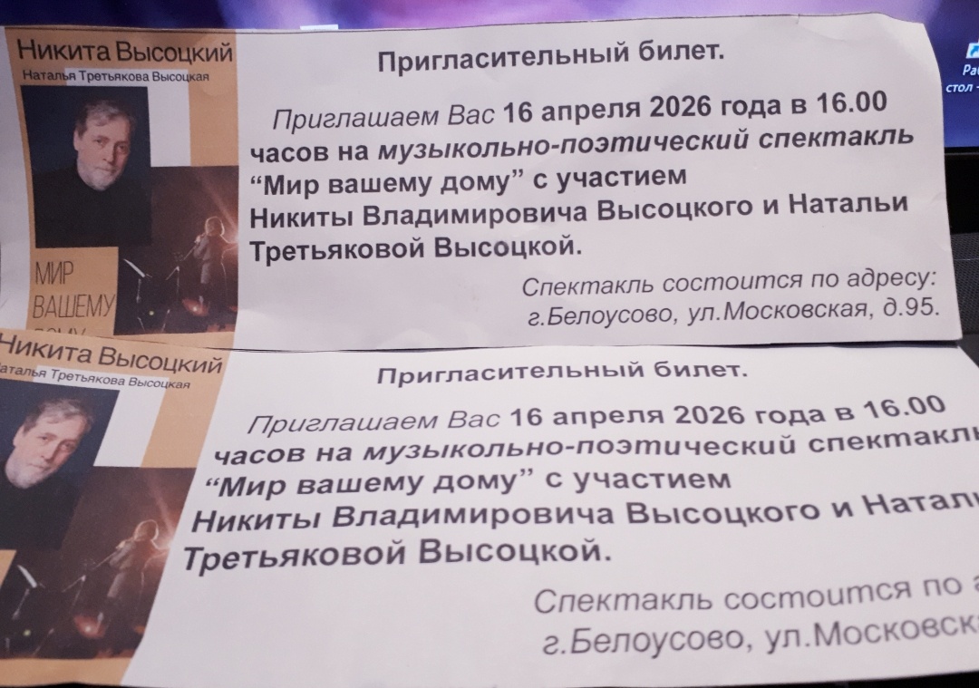 В маленький городок Белоусово, в ста километрах от Москвы, в Калужской области вчера приезжал Никита Высоцкий - сын известного и до сих пор любимого очень, очень многими россиянами поэта, актёра Владимира Высоцкого. Я побывала на этом мероприятии. Вы знаете, голос Никиты с годами всё больше похож на голос отца. В фойе Дома Культуры много фотографий Владимира Семёновича. Некоторые кадры из его фильмов или просто из разных периодов жизни. Зал не был набит битком, всё-таки рабочее время - 16 часов, четверг. Но зрителей пришло не мало. Надеюсь только те, кто ценит творчество Высоцкого старшего. В Белоусово есть традиция - раз в два года сюда приезжает Никита с песнями отца. Хорошая традиция, интересная. А ведь городок совсем маленький, жителей около одиннадцати тысяч. Так что здорово в таком крохотном городе увидеть на сцене сына великого народного поэта, послушать его песни и стихи. Всё мероприятие длилось почти два часа. За это время Никита Владимирович ни разу не присел на стул, которы