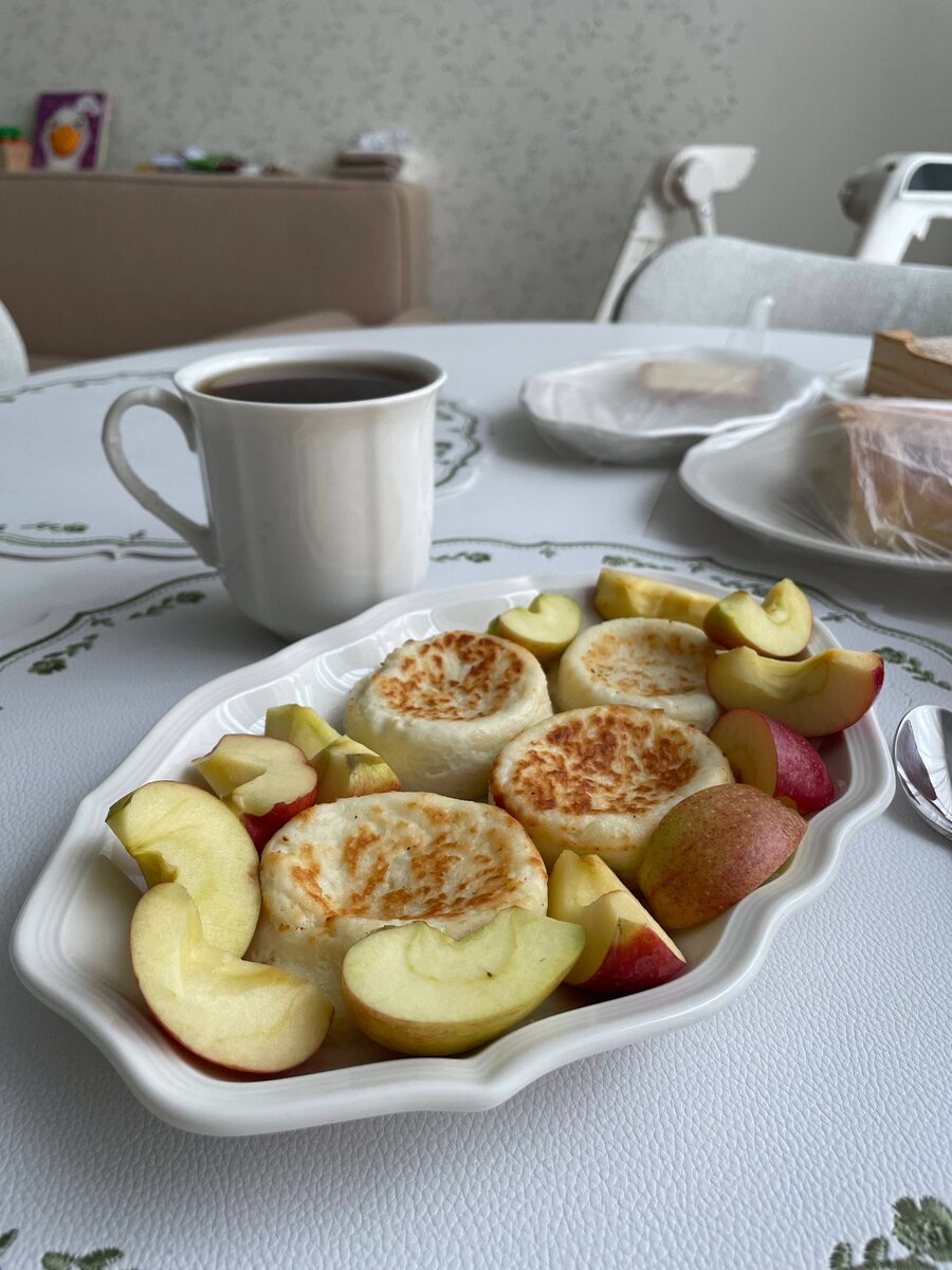 Сегодня: на завтрак сырники с яблоком; на перекус 2 куска чиабатты с сыром и киви, половина мвндарина; на обед кускус+креветки+руккола+1/4