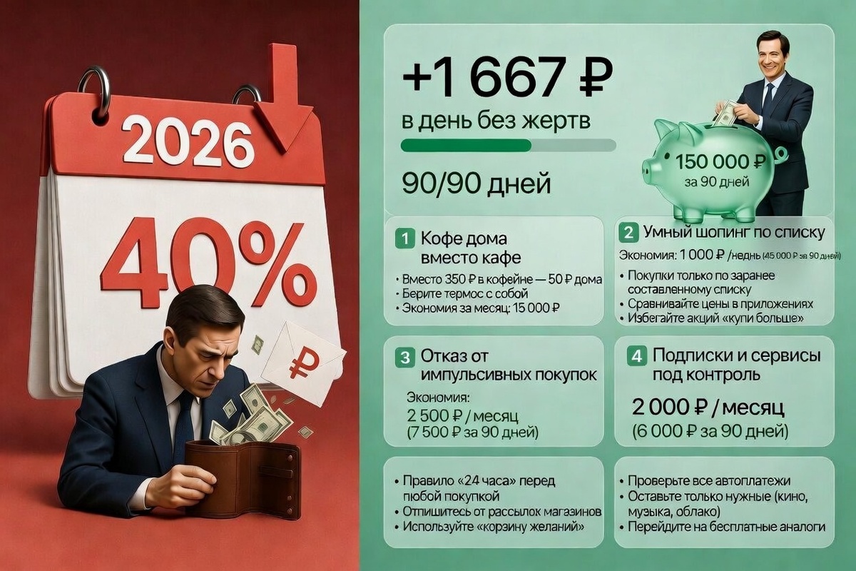 Инфляция 9,2% жрёт сбережения, подписки крадут 3к/мес, импульс-шопинг съедает 15к/мес — итог: минус 200к в год. Читатели в минусе, а вы можете перевернуть. Расскажу приёмчики 2026: от хаоса трат к +150к за 90 дней. Завтра стартуете — увидите плюс на счёте через неделю.