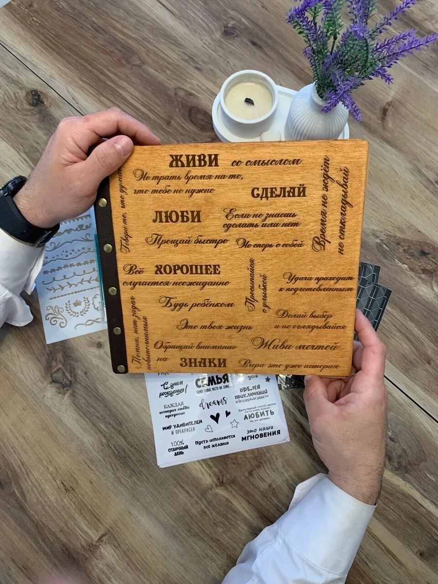 Натуральные материалы, ручная работа, деревянная обложка с глубоким рисунком, лазерная гравировка, масло по дереву, крафтовая коробка — всё это вживую ощущается не как набор красивых слов, а как нормальная, хорошо сделанная вещь.