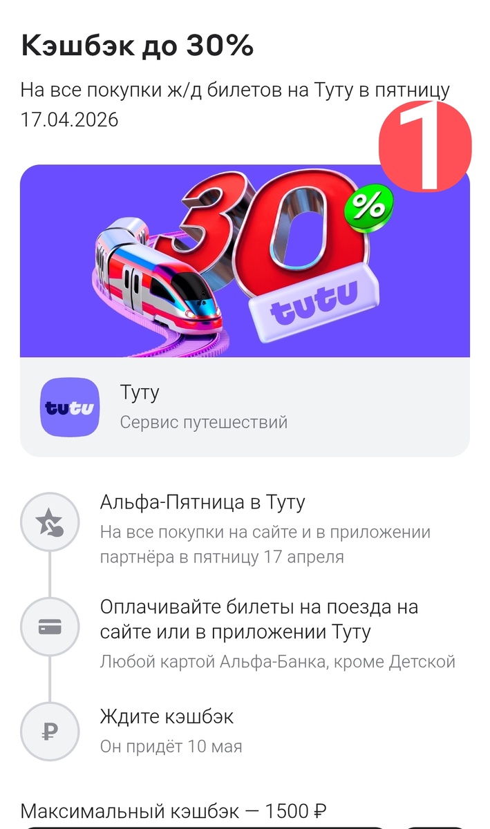 ✔️ На каледаре - пятница, вспоминаем про Альфа-банк. Сегодня можно получить кешбэк 30% за покупку билетов на поезд в сервисе Туту (скрин 1).
