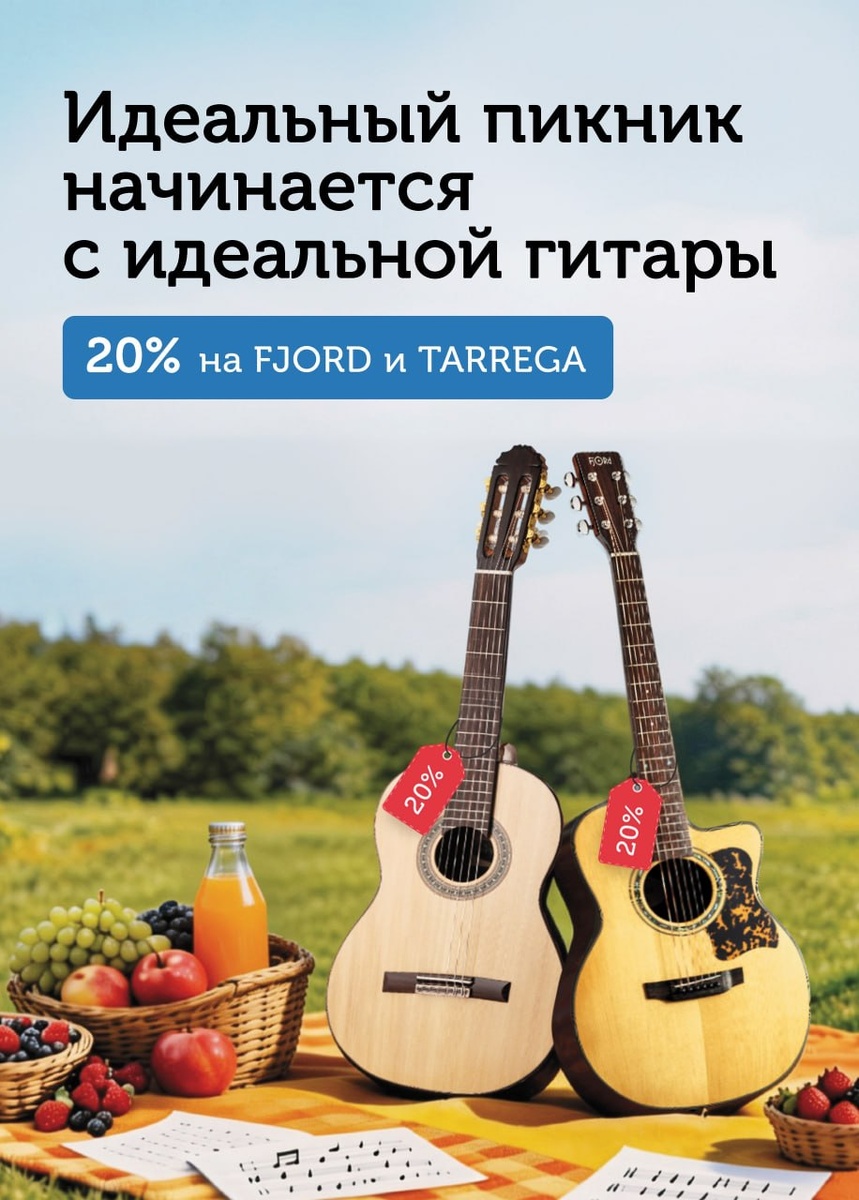 Промокод ПИКНИК. Хватит скучать дома. Весна — время доставать гитару и собирать друзей. Или просто брать инструмент с собой на прогулку. С нашими гитарами любая поездка превращается в концерт. Что выбрать? • Fjord — современные, лёгкие, удобные в поездках. Яркий звук, продуманный дизайн. • Tarrega — классика с тёплым, певучим тембром. Для тех, кто ценит традиции. Условия простые: заходите на сайт, выбираете любую модель, вводите промокод ПИКНИК и получаете скидку. До 1 мая. Ссылка на каталог: https://www.glinki.ru/catalog/strunnye/gitary/filter/brand-is-fjord-or-tarrega/apply/