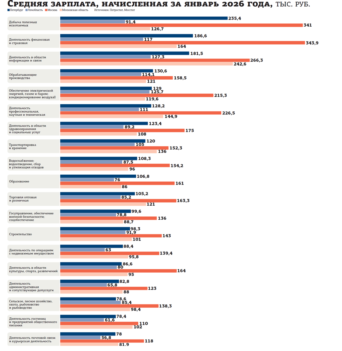 Отслеживать официальную динамику зарплат приходится с отставанием в несколько месяцев. На текущий момент Петростат и Мосстат только–только опубликовали данные по оплате труда за январь 2026 года. Из них следует, что средняя начисленная номинальная зарплата в Петербурге составила 118,8 тыс. рублей, в Ленинградской области — 95,2 тыс. Соответственно, в Москве — 187,6 тыс. рублей, а в Московской области — 124 тыс. В январе 2025 года жители Петербурга в среднем получали 106 тыс. рублей, Ленобласти — 85,6 тыс., Москвы — 156,2 тыс., Московской области — 105,5 тыс.
