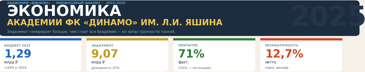 То есть если говорить не о рекордном 2025-м, а о более нормальной и спокойной зоне доходности, то для полного ухода от зависимости от ФК «Динамо» эндаументу нужен размер скорее 12–14 млрд ₽, а не нынешние 9 млрд ₽.