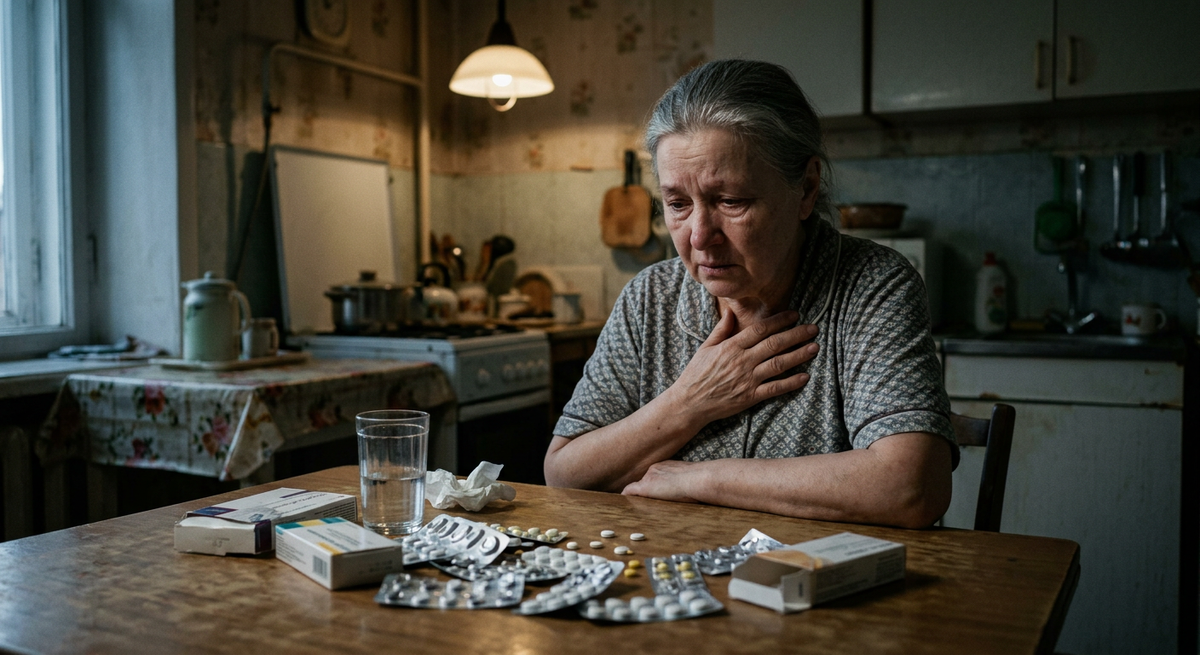 Дрожащими руками она пытается найти нужную белую упаковку, роняет блистер на пол, мелкие таблетки разлетаются по линолеуму и закатываются под холодильник.