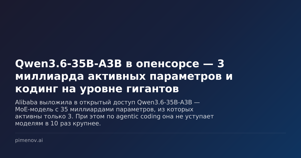 Alibaba выложила в открытый доступ Qwen3.6-35B-A3B — MoE-модель с 35 миллиардами параметров, из которых активны только 3. При этом по agentic coding она не уступает моделям в 10 раз крупнее. Alibaba выкатила в открытый доступ новую модель из серии Qwen — и цифры в названии тут не для красоты. Qwen3.6-35B-A3B — это sparse MoE-модель (Mixture of Experts, «смесь экспертов»). Внутри 35 миллиардов параметров, но в каждый момент времени работают только 3 миллиарда. Представьте команду из 35 человек, где на каждую задачу выходят трое самых подходящих. Остальные не тратят ресурсы. Что это значит на практике: модель запускается на обычном железе, потребляет мало памяти — но при этом в agentic coding (автономное написание кода по задачам) показывает результаты на уровне моделей, которые в 10 раз крупнее по активным параметрам. Плюс мультимодальность: модель понимает изображения, а не только текст. И два режима мышления — с «размышлением» и без, как уже привычно по o1/o3 от OpenAI. Лицензия — Apa