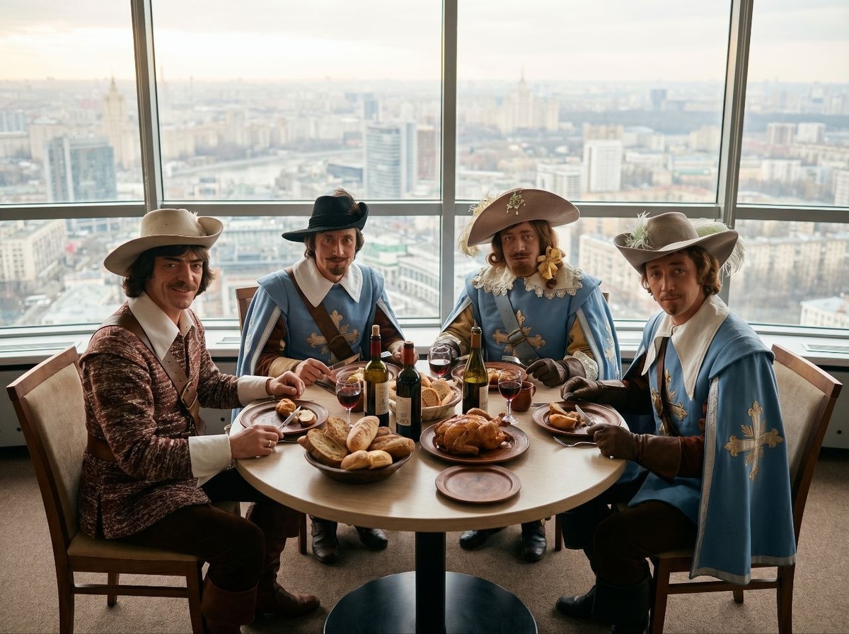 С Добрым утром. Продолжаем тему Мушкетеров. От подписчика @UjinGr Переработай изображение сцена «завтрака четырёх мушкетёров» в бастионе Сен-Жерве из фильма "Д’Артаньян и три мушкетёра" 1978 года так, чтобы Д’Артаньян и три мушкетёра оказались в ресторане седьмое небо на Останкинской башне. Персонажи из советского фильма "Д’Артаньян и три мушкетёра" 1978 года, актеры Боярский, Вениамин Смехов , Валентин Смирнитский, Игорь Старыгин. Их изображения на загруженных изображениях. Продукты и антураж перенести из бастиона в башню. Сохранить изображение главных героев из фильма один в один без изменений. Цветовая гамма — взята из фильма. Photorealistic, 50mm, shallow depth of field, soft diffused light, cinematic bokeh, natural skin texture, high detail, sharp focus, 4k. --ar 4:3 --style raw Негативный промпт: лишние пальцы, лишние руки, деформация кистей, два телефона, размытие, низкое разрешение, watermark, текст, логотипы, bad anatomy, oversaturated, jpeg artifacts most-AI.com - 80+ попу