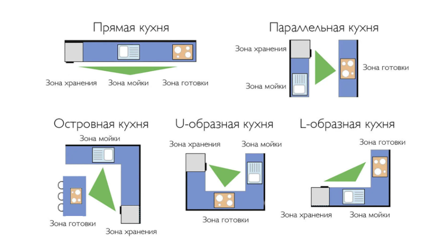 Как выглядит: Холодильник стоит у входа на кухню, мойка — у окна, плита — у противоположной стены. Чтобы приготовить ужин, вы наматываете километры.
