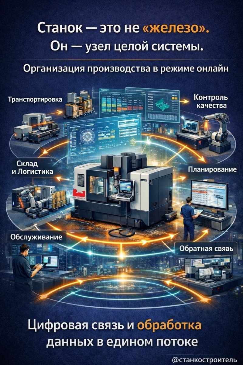”. Станок — это узел целой системы. И побеждает тот, кто управляет потоком информации так же жестко, как режет металл. Смысл развития станкостроения сегодня простой: производство рассматривают как набор функциональных зон и связей. Технология обработки — одна часть цепи. Но рядом стоят транспорт, хранение, обслуживание и контроль — и всё это должно работать в единой логике. Поэтому металлообрабатывающая машина всё чаще становится компонентом общей технологической системы, а не изолированным устройством. Дальше включается главный рычаг — техника управления и обработка данных. Новые электронные блоки дают импульс не только “для управления станком”, а для управления всем процессом: планирование → выполнение → обратная связь → контроль. Ключевые преимущества (что даёт инженерный подход “в системе”) - Единые контуры информации: инструкции и обратные сигналы идут связно, без потерь между машиной и производством. - Работа в истинном времени: управление “под процесс” — когда контур успевает
