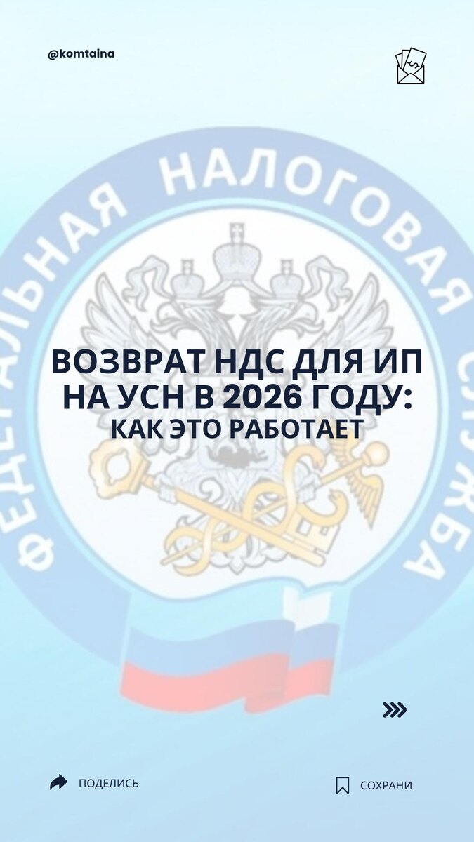 Возврат НДС для индивидуальных предпринимателей на УСН в 2026 году происходит по общим правилам. Базовый механизм завязан на ЕНС: чтобы вернуть переплату или сумму к возмещению, необходимо подать в инспекцию заявление о распоряжении средствами ЕНС посредством возврата. Стандартный срок перечисления - 2 рабочих дня с момента получения заявления инспекцией. При этом в случае возмещения НДС сроки зависят от того, когда подано заявление - до или после принятия решения о возмещении. Если инспекция нарушает срок возврата, на сумму начисляются проценты. А больше про НДС и его оптимизацию вы узнаете в сервисе Бенефициар НДС. Переходите за бесплатной консультацией в Телеграм. 👉 @ProffLinkBot ❗️Насколько вы контролируете возврат НДС? 🔥 Полностью ведем процесс 👍 Частично контролируем 🤔 Не углублялись @komtaina