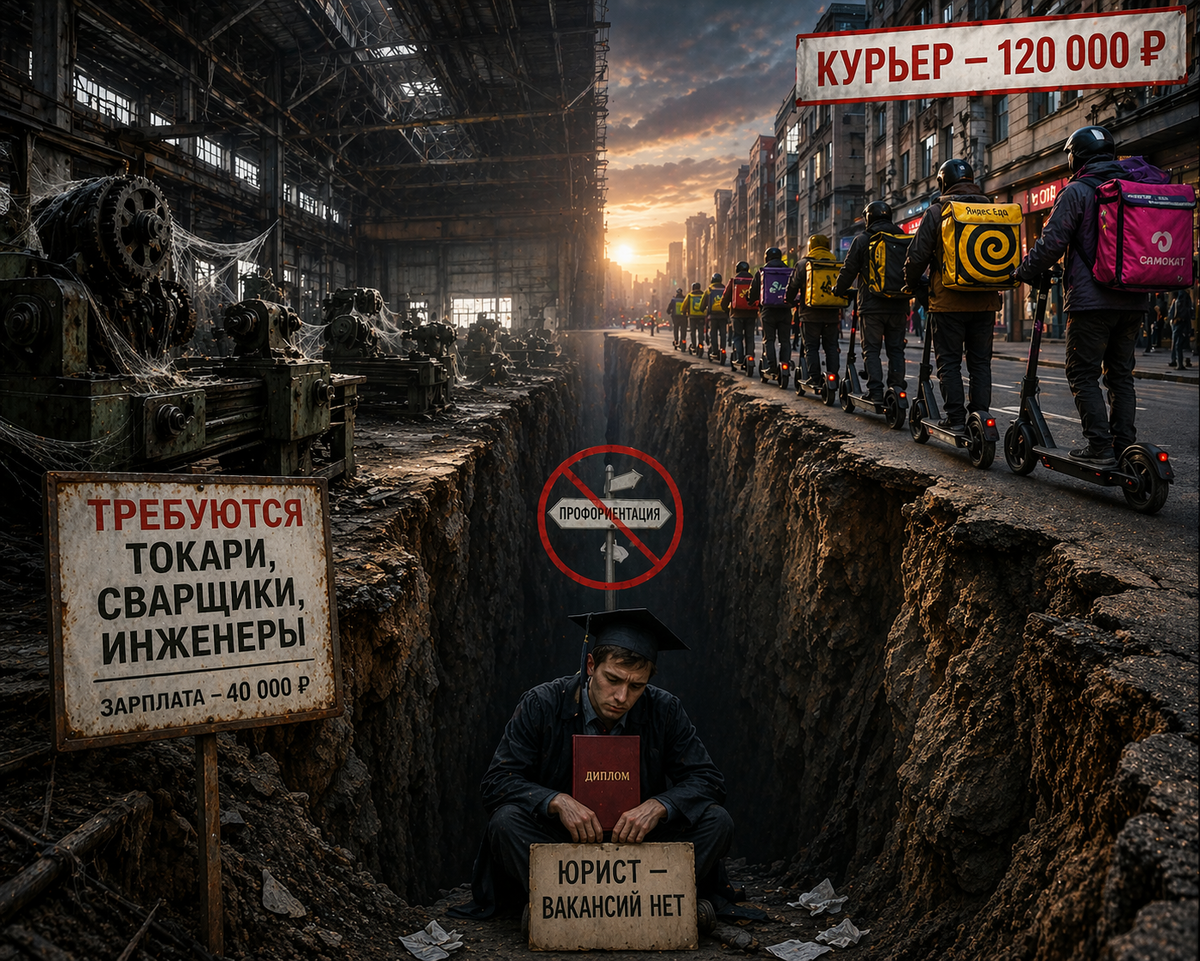 Парадокс: Система высшего образования штампует дипломы по специальностям, которые не нужны рынку. А профтехучилища закрылись в 90-е, и новых не открыли. И теперь, когда страна осталась без рук, оказалось, что некому стоять у станка. А «белые воротнички» сидят без работы. Или работают курьерами. Потому что курьером проще, чем идти на завод, где платят 40 тысяч.
