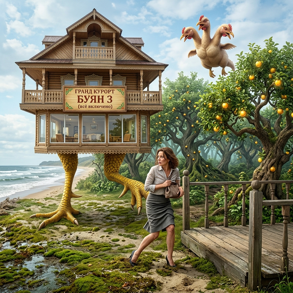 1 Если вы когда-нибудь просыпались с полным ртом водорослей и стойким ощущением, что вчерашний корпоратив закончился падением в аквариум с морепродуктами, то вы меня поймете. Я с трудом разлепила один глаз. В него тут же попал песок. В голове гудел набат, воспоминания о вчерашнем, да и о позавчерашнем дне стерлись подчистую, оставив лишь мутные воспоминания и чей-то крик: «Дашка, держи кокошник!». Какой кокошник? Я — главный бухгалтер в фирме «Милый прикид», ли Машка так диадему назвала? Я приподнялась на локтях. Вокруг расстилался живописный берег, шумело море, а в воздухе почему-то воняло жареными семечками. Слева раздалось отчетливое и басовитое: «Ко-ко-ко!». Я медленно повернула голову. На берегу, переминаясь с ноги на ногу — причем ноги были покрыты желтой пупырчатой чешуей, оканчивались внушительными когтями и по толщине напоминали опоры ЛЭП, — стоял самый настоящий двухэтажный отель. Деревянный, с резными балкончиками, мансардой и обнадеживающей вывеской «Grand Resort Buyan 3 (в