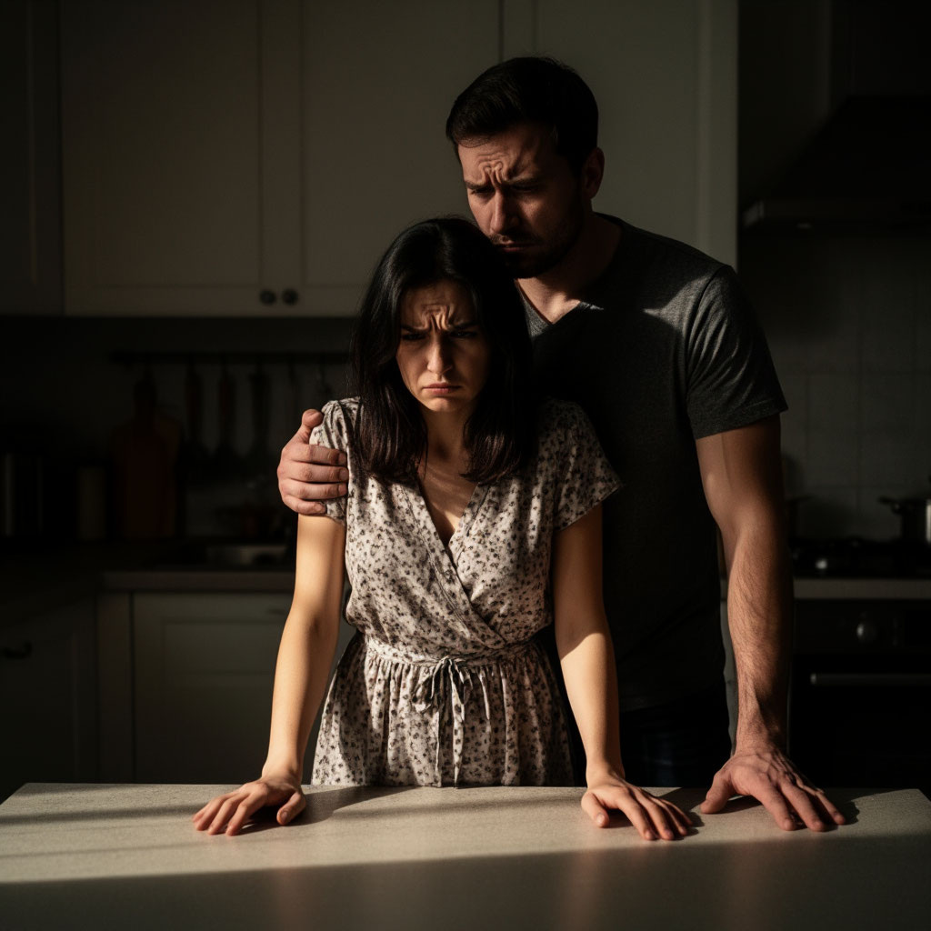 Сергей вернулся поздно. Он вошел в дом, не включая свет, и сел за стол на кухне. Вера подошла сзади и положила руки ему на плечи.